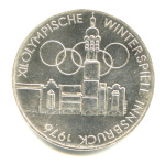 100 шиллингов — Здания и Олимпийская эмблема. XII зимние Олимпийские Игры, Инсбрук 1976. (Коллекционная монета) 1975 eagle