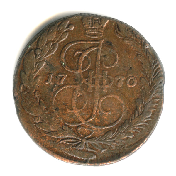 5 копеек — Вензель императрицы Екатерины II Великой. Орел 1768 г. Екатеринбург 1770 ЕМ (Российская Империя)