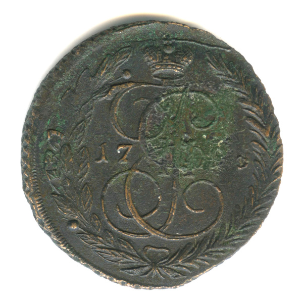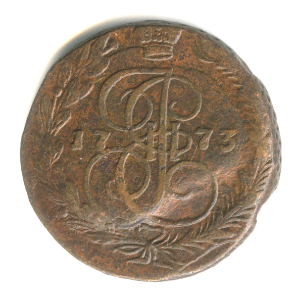 5 копеек — Вензель императрицы Екатерины II Великой. Орел 1768 г. Екатеринбург 1773 ЕМ (Российская Империя)