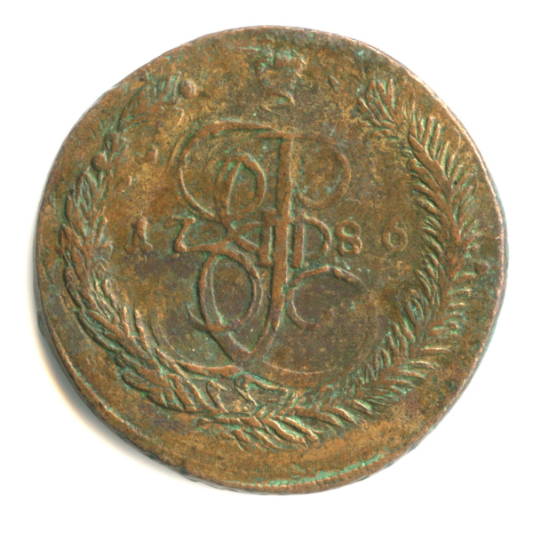 5 копеек — Вензель императрицы Екатерины II Великой. Орел 1780 г. Екатеринбург 1786 ЕМ (Российская Империя)