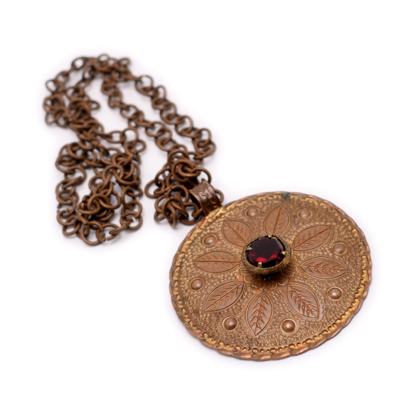 Кулон с растительным узором. На цепочке. Металл. Со вставкой. ⌀ 6,2 см. 63 см