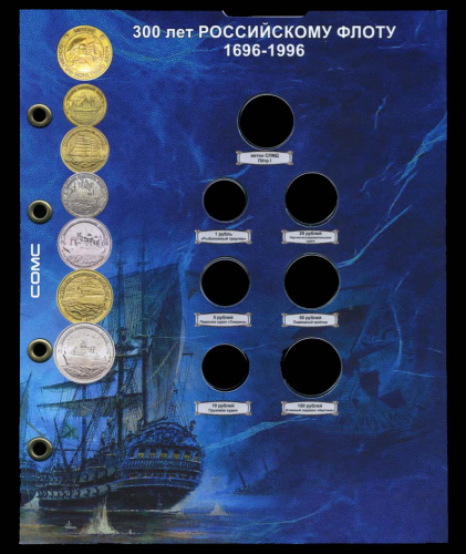 Лист блистерный стандарта OPTIMA для монет 300 лет Российскому флоту 1696−1996гг. Новый в упаковке. 250×200мм (Россия)