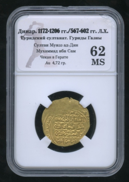 динар 1172−1206. В слабе. (567−602 годы Хиджры). Гуридский султанат. Гуриды Газны. Султан Муиззад-Дин Мухаммад ибн Сам. Монетный двор — Герат. В слабе…