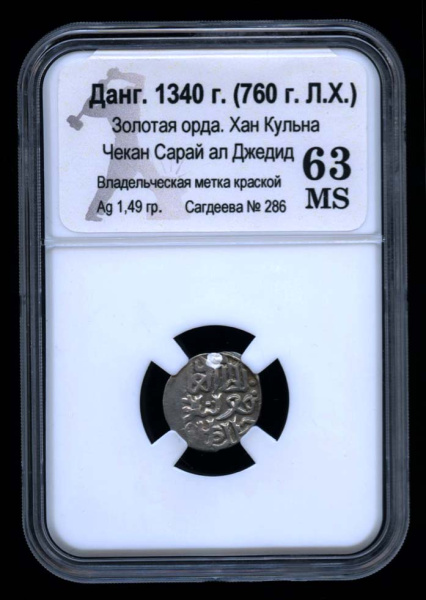 Данг. Золотая орда. Хан Кульна. Чекан Сарай ал Джедид. Владельческая метка краской. 1340. В слабе® MS 63 (Русское царство)