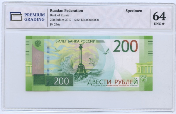 200 рублей 2017. В слабе. Образец. БВ 000000000 В слабе PREMIUM GRADING 64 Unc (Россия)