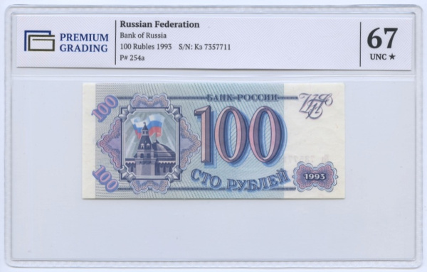 100 рублей (Pick: # 254) 1993. В слабе. В слабе PREMIUM GRADING 67 Unc (Россия)