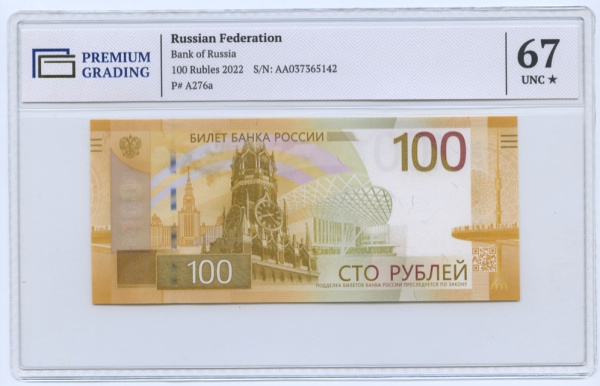 100 рублей (Pick: # wa276) 2022. В слабе. В слабе PREMIUM GRADING 67 Unc (Россия)