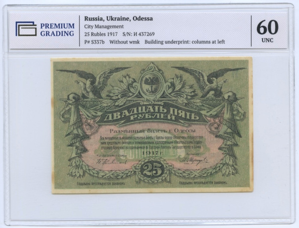 25 рублей Одесса 1917. В слабе. В слабе PREMIUM GRADING 60 Unc (Россия: Гражданская война)