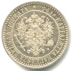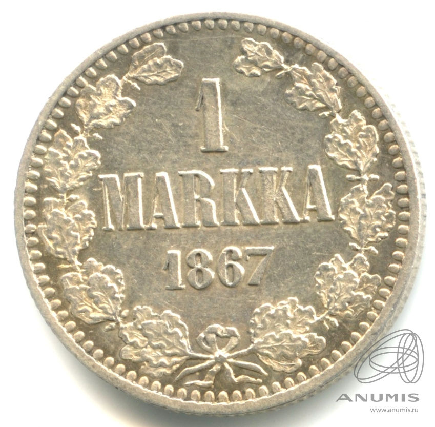 Монета регионального выпуска: 1 марка 1867 года «Для Финляндии». 1 марка 1864 — 1915 гг. Российская Империя: Александр II (1855 — 1881). Минцмейстер: August Frederick Soldan, Август Фридрих Сольдан (1864−1885). Серебро 868, 5 г, ø 24 мм, Гурт: Рубчатый. Тираж: 852000 шт.
