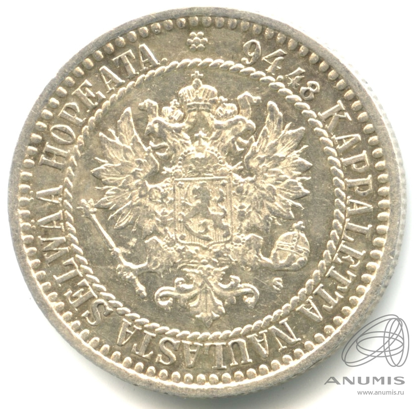 В центре изображён полный Герб Великого княжества Финляндского — двуглавый орёл, головы которого увенчаны двумя коронами, третья, большая корона над ними. Все они соединены орденской лентой ордена Св. Апостола Андрея Первозванного. На груди орла расположен щит с титульным гербом Великого князя Финляндского, увенчанный княжеской короной. Вокруг щита орденская цепь с орденом Св. Апостола Андрея Первозванного. В правой лапе орла — скипетр, в левой — держава. Под левой лапой знак директора Гельсингфосского монетного двора — литера «S», August Frederick Soldan (Август Фридрих Сольдан). Вокруг центрального изображения — витой ободок. За ободком круговая надпись: «94.48 KAPPALETTA NAULASTA SELWÄÄ HOPEATA», сверху разделённая цветочной розеткой. По окружности канта имеются рельефные элементы, выполненные в виде зубцов.