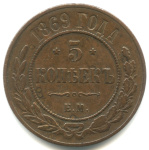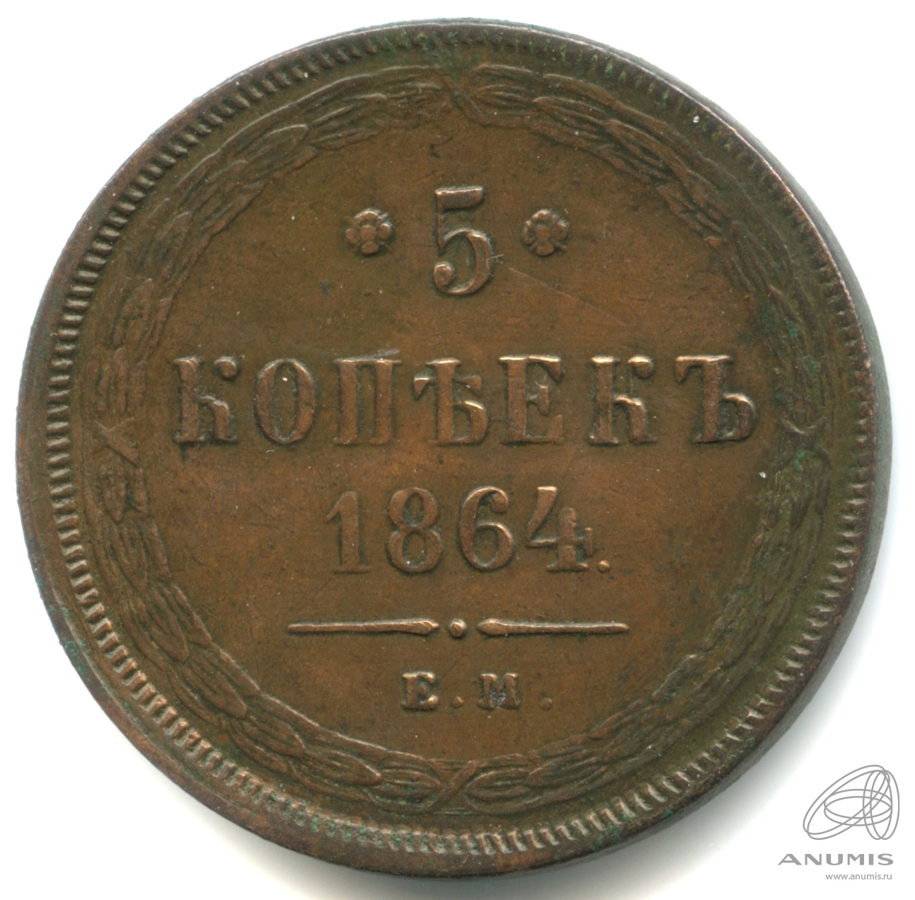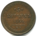 В центре указан номинал «5», ограниченный с обеих сторон цветочными розетками. Под цифрой номинала слово — «КОПЕЕК», под ним год выпуска монеты «1864.». Ниже, расположен декоративный разделитель в виде двух фигурных линий и небольшой точки между ними. Под разделителем обозначение монетного двора «Е.М.».По окружности, вдоль канта, декоративный венок вверху, внизу, справа и слева крестообразно перехваченный лентами.