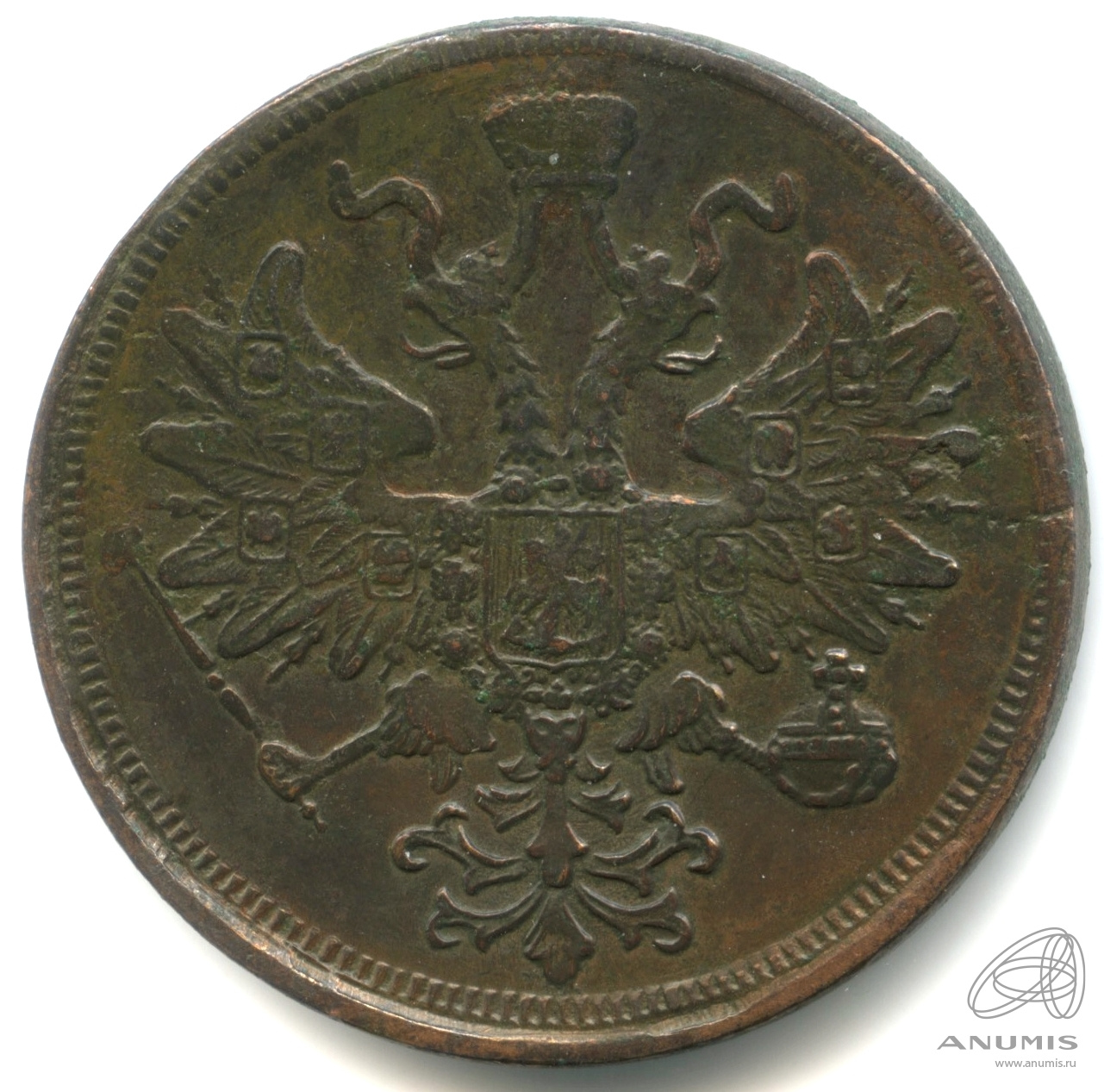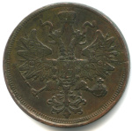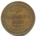 Монета регулярного выпуска: 5 копеек 1864 года «Орел 1859 г». 5 копеек 1849 — 1867 гг. Российская Империя: Александр II (1855 — 1881). Монетный двор: Екатеринбургская монета, г. Екатеринбург. Медь, 26 г, ø 36−36 мм, Гурт: Гладкий. Тираж: 26042240 шт.