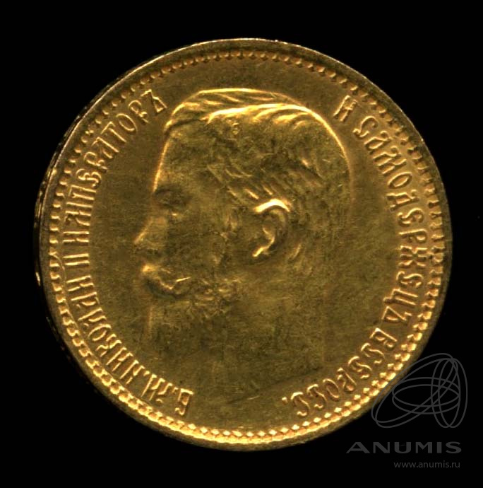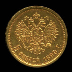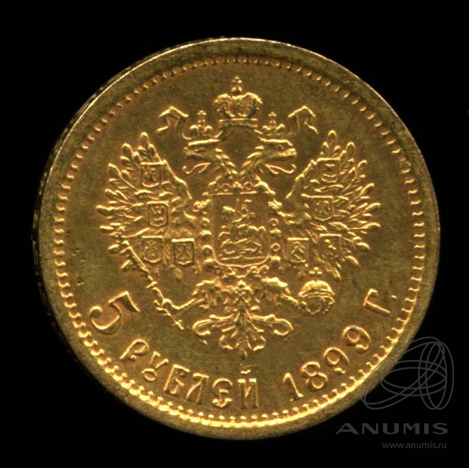 Монета регулярного выпуска: 5 рублей 1899 года «Портрет Николая II». 5 рублей 1897 — 1911 гг. Российская Империя: Николай II (1894 — 1917). Минцмейстер: Феликс Давидович Залеман (1899−1901). Золото 900, 4 г, ø 19 мм, Гурт: Узор. Тираж: 20400004 шт.