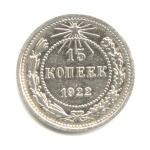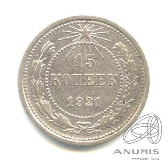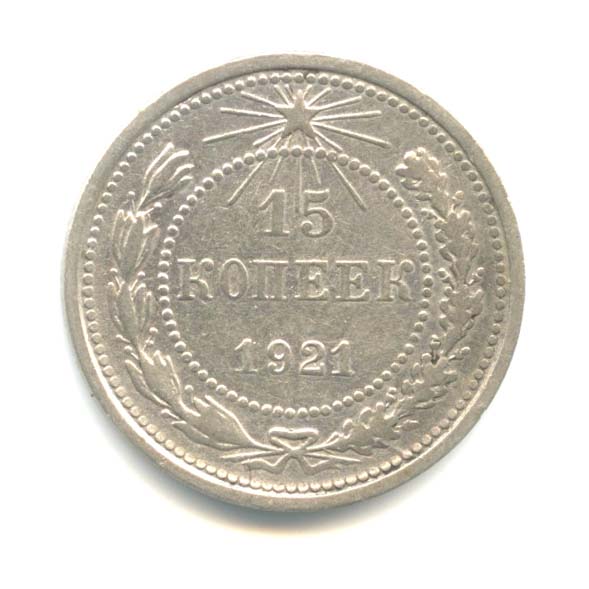 Монета регулярного выпуска: 15 копеек 1921 года. 15 копеек 1921 — 1923 гг. Российская Советская Федеративная Социалистическая Республика: РСФСР (1919 — 1923). Серебро 500, 3 г, ø 20 мм, Гурт: Рубчатый. Тираж: — шт.