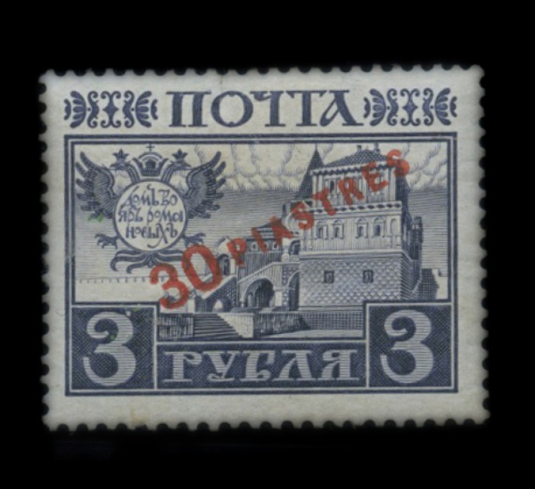 «Русский ливант. Надпечатка на марке 3 рубля серии 300 лет дому Романовых. Каталожная цена марки 3 рубля по каталогу Загорского 5600р». Размер 3×2,5 см. Чистая