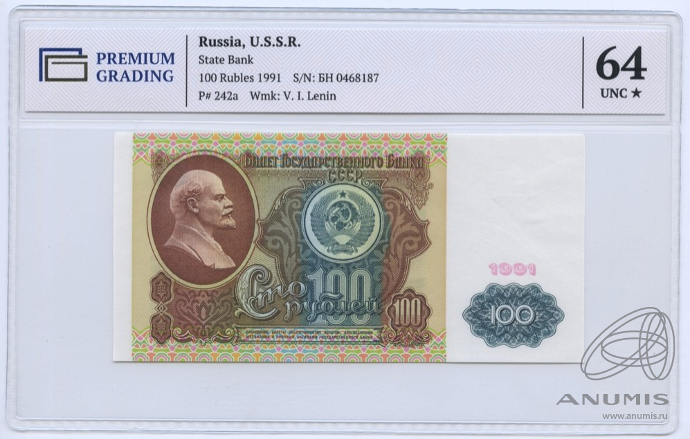 100 рублей (Pick: # 242) 1991. В слабе. В слабе PREMIUM GRADING 64 Unc
