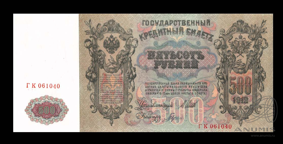 Банкнота регулярного выпуска: 500 рублей 1912 года «упр. Шипов. Гаврилов». Государственные Кредитные Билеты 1898 — 1912 гг. И.П. Шипов. Российская Империя: Николай II (1894 — 1917).