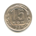Монета регулярного выпуска: 15 копеек 1934 года «Со щитом». 15 копеек 1931 — 1934 гг. Союз Советских Социалистических Республик: СССР ранний (1924 — 1958). Медь-никель, 3 г, ø 20 мм, Гурт: Рубчатый. Тираж: 58367000 шт.